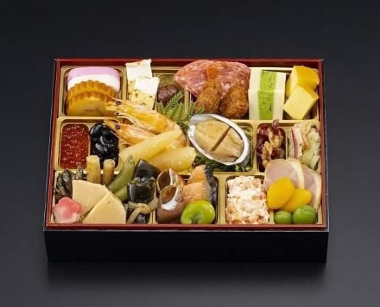 バイ貝醤油煮 / 空豆塩煮 / 鮭の塩焼き / 紅蒲鉾 / 白蒲鉾 / 伊達巻 / ボロニアソーセージ / デミグラスハンバーグ / 伊達板スフレケーキ / 高野豆腐とほうれん草のはさみ煮 / 黒豆煮 / 大根と人参のなます / いくら醤油漬け / ボイル海老 / 数の子醤油漬け / 鮑酒蒸し / 中華わかめ / 紅ズワイガニの紅白テリーヌ / 芋きんとん / 渋皮栗甘露煮 / サーモンクリームチーズ / 合鴨オレンジソース煮 / 若桃のシロップ漬け / 杏子白ワイン煮 / クランベリーとクルミのシロップ煮 / カナダホッキ貝と大根のバジル和え / 片口鰯の田作り / 牛蒡煮 / 筍土佐煮 / にしん昆布巻 / エンドウ醤油漬け / 梅麩甘煮